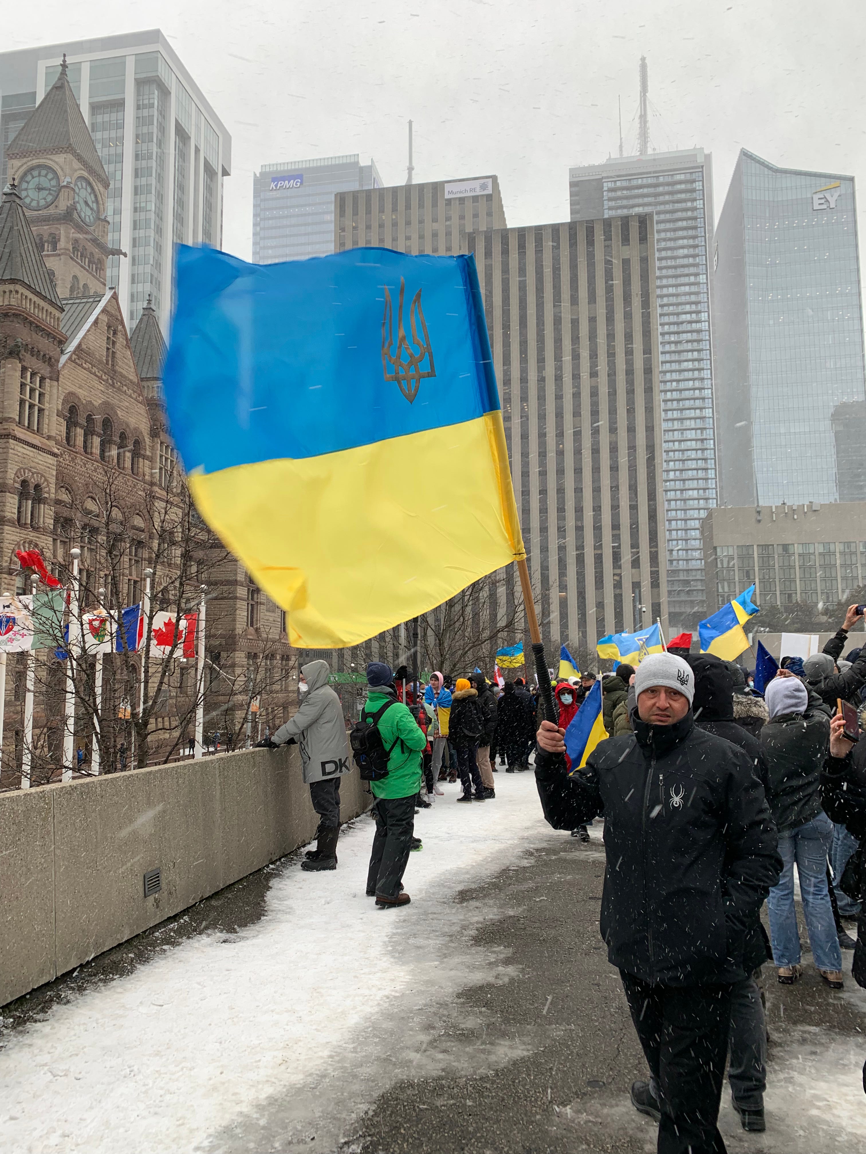 Three weeks ago, I found myself attending a protest against Russian aggression outside Toronto City Hall on a very snowy Sunday afternoon. There were hundreds of people — all bracing against a sharp wind —holding up signs and decrying the war. I felt both depressed at what was bringing us there, and cheered in the solidarity of dissent. The city was weary from weeks of a different, and much more hostile, type of protest—weeks of yelling and car horns, as people angry about vaccine mandates marched in the street. And then, after watching with relief as the trucking convoy was forcibly removed from Ottawa, abruptly it was me who was in the street, the human toll of Russia’s war was too serious to stay inside.